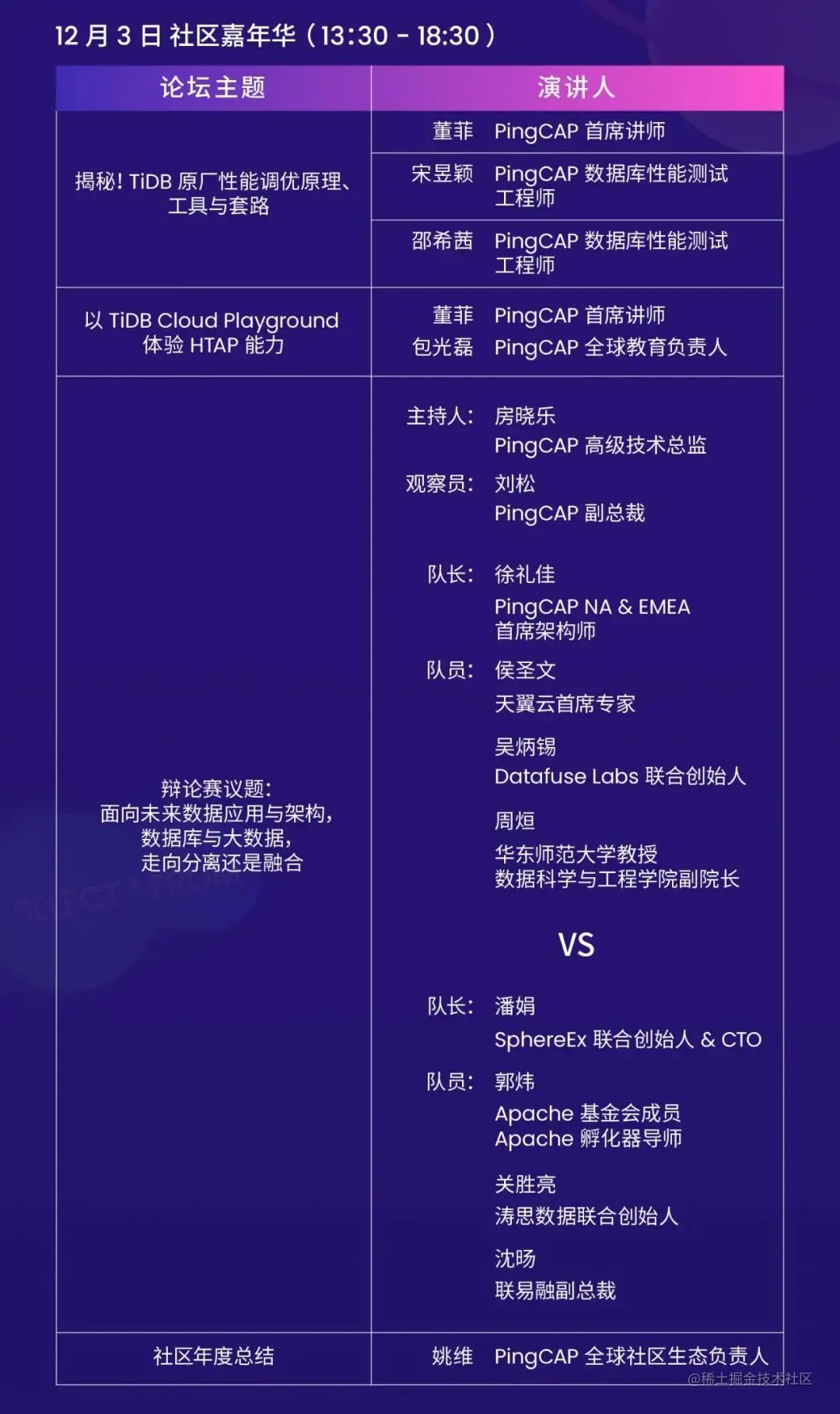 用一个趣味 workshop 为你揭秘 TiDB 原厂性能调优原理、工具与套路;用 TiDB Cloud Playground 体验 HTAP 能力;更有趣味辩论赛,与众多大咖共同探讨数据库与大数据技术的未来方向!