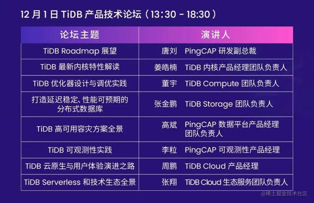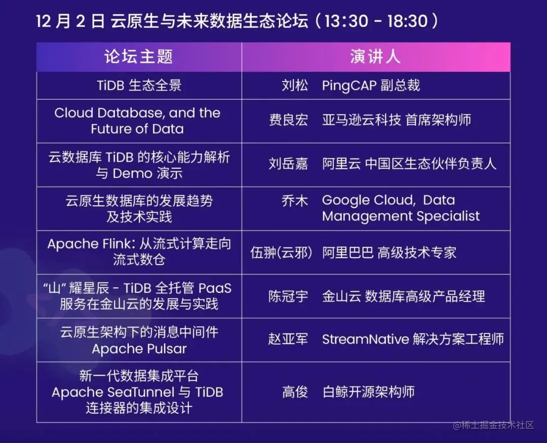 我们邀请到了十余位 TiDB 深度用户,包括来自银河证券、微众银行、安信证券、建信金科等金融行业的用户,以及硬之城、云盛海宏等制造、零售行业用户,与我们分享企业数字化转型中第一线的实践与收获。同时 数据库行业意见领袖韩锋、徐戟(白鳝),以及来自 PingCAP 的技术专家,将全方位解析企业业务发展过程中面临的架构难题,结合实际场景,分析新一代数据库应对挑战需要具备哪些能力。