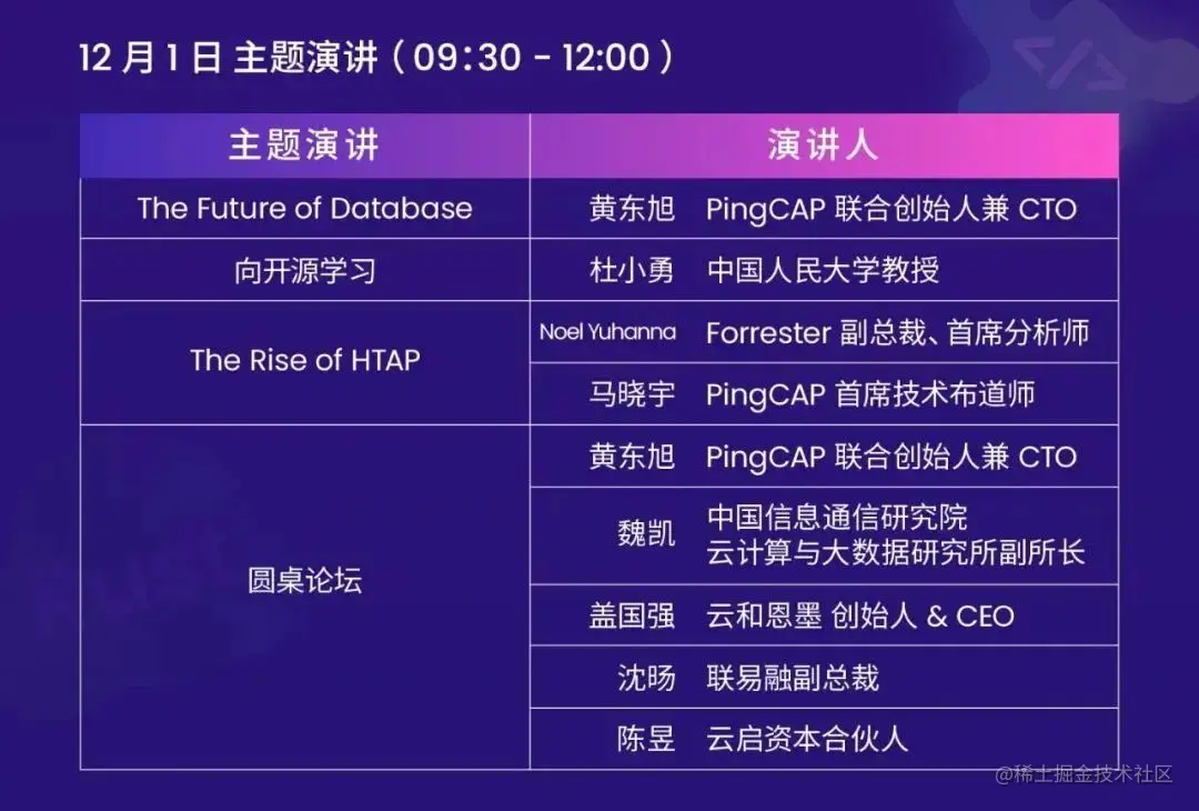 PingCAP 联合创始人兼 CTO 黄东旭、中国人民大学杜小勇教授、Forrester 副总裁、首席分析师 Noel Yuhanna、PingCAP 首席技术布道师马晓宇将发布主题演讲;同时,黄东旭将与众多来自各行业的技术大咖同台交流,年度盘点,从北美到中国,从不同角度探讨对技术趋势的判断,谈论技术与行业场景结合的产业趋势和应用模式。
