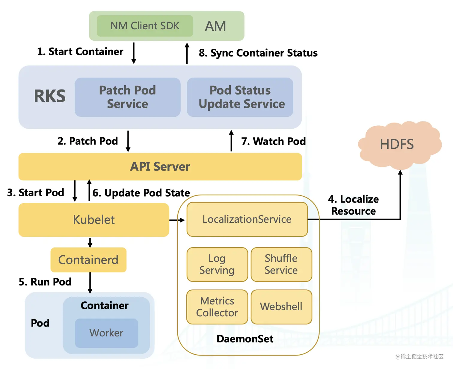 Pod Status Update Service : 该服务会及时从 API Server Watch Pod 的最新状态,并将状态返回给对应 AM;