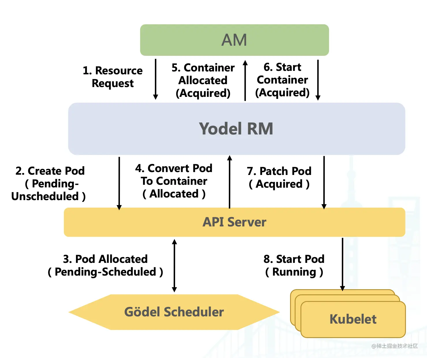 - Yodel RM 创建 AM Pod 并写入 API Server,等待底层调度器调度;