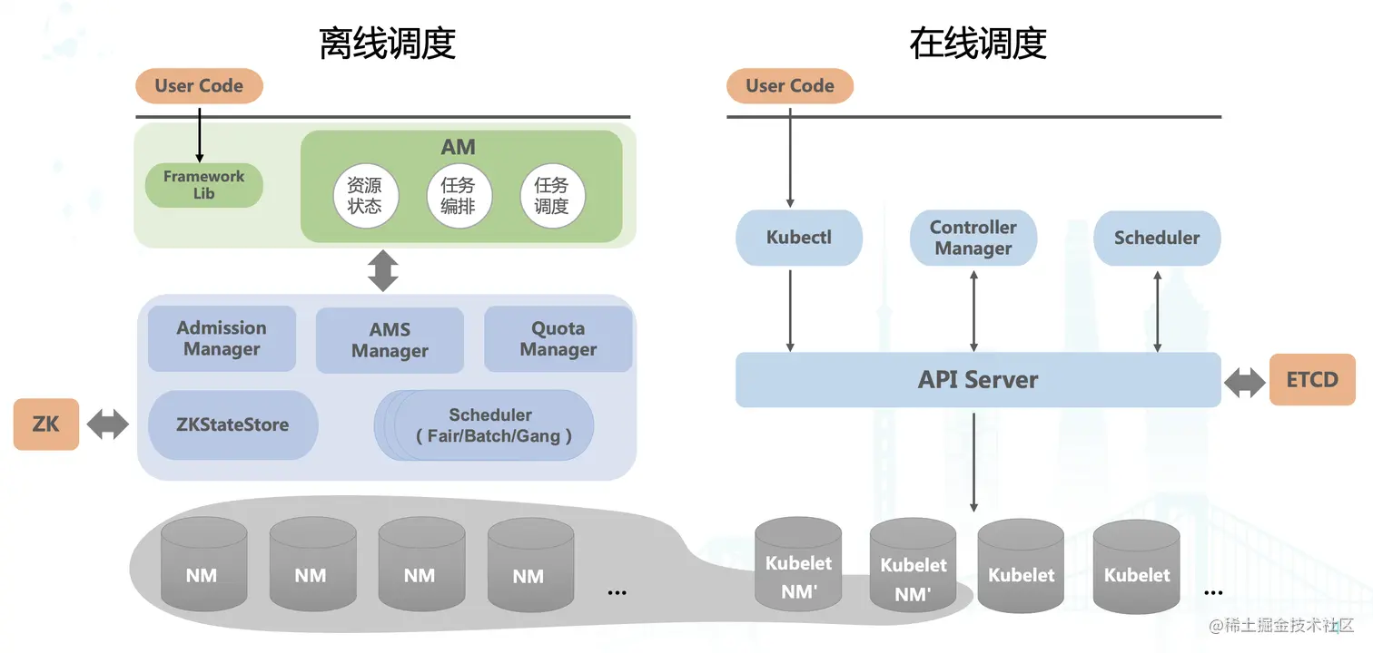 如上图所示,我们可以清楚地看到,字节内部调度架构分为两大块 —— 离线调度系统和在线调度系统,离线调度系统主要负责离线资源管理和离线任务调度,在线调度系统主要负责在线资源管理和在线任务调度。