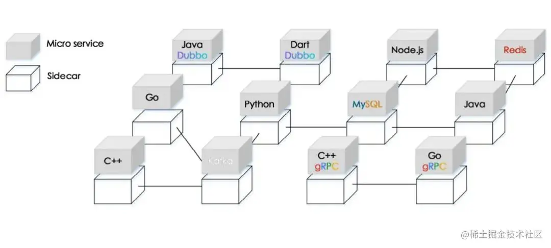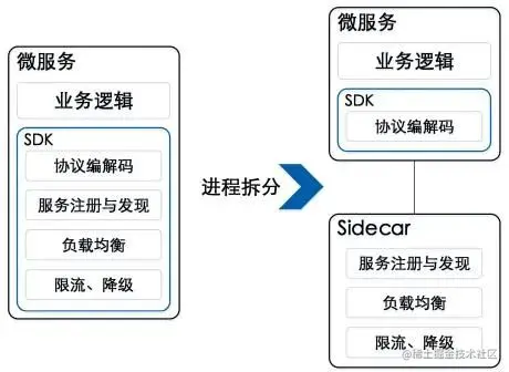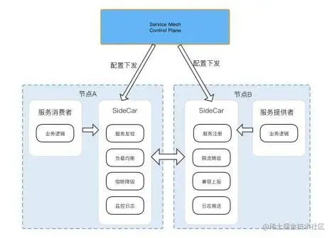 服务网格架构是容器化的产物,引入了类似代理的Sidecar,在微服务SDK里面保留协议编解码能力,把服务注册与发现、负载均衡、熔断、限流、降级等服务治理能力下沉到Sidecar。当该 sidecar 在微服务中大量部署时,这些 sidecar 节点自然就形成了一个网格。