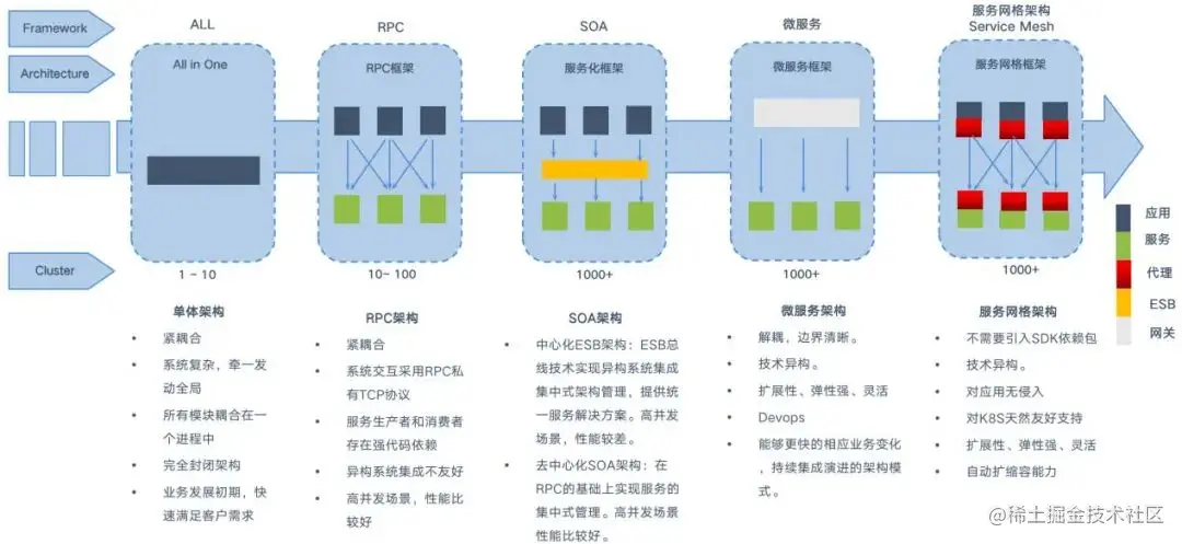 应用服务架构一直处于不断演进的过程中,上图通过对比5种比较主流的架构模式,展示了应用架构的演进历程和变化。