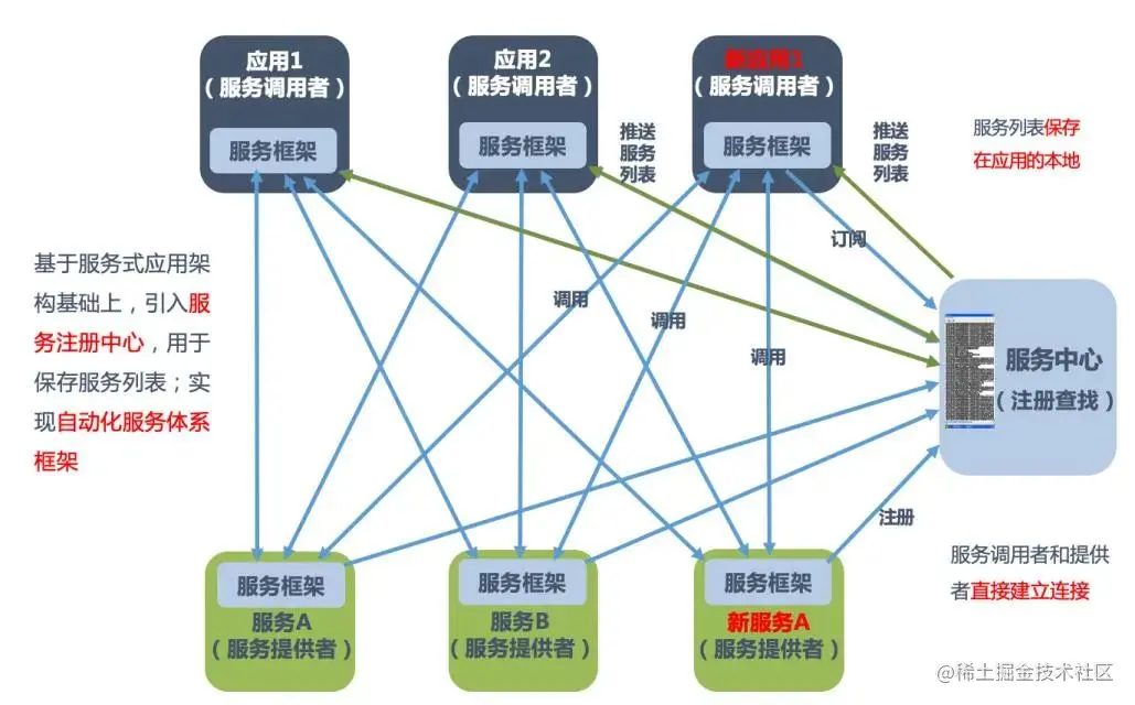 个人认为SOA架构经历了两个阶段,一是以ESB中心化的架构,二是以注册服务为中心的服务注册发现架构(上图)。