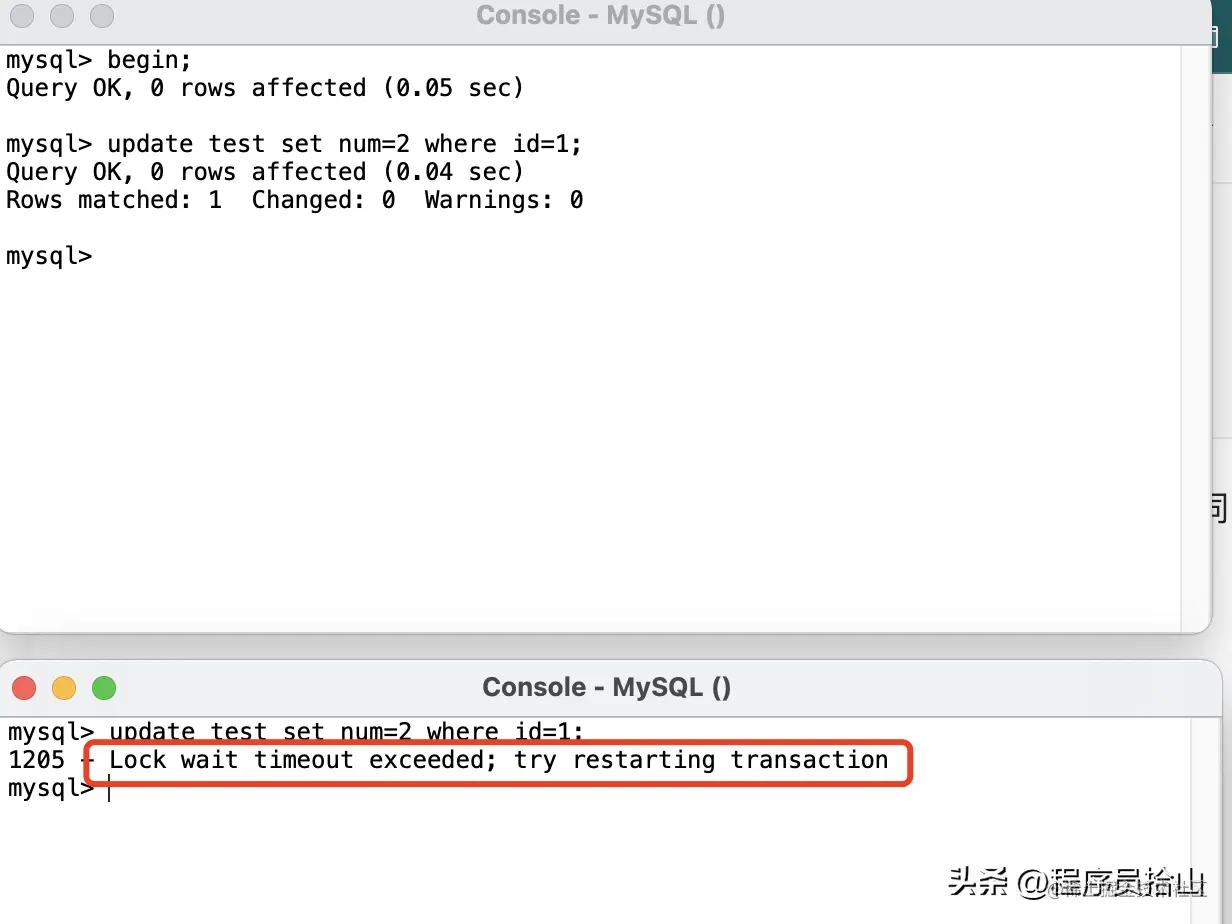 如上图所示,如果第一个事务不提交,则第二个事务一直被阻塞,直至事务超时回滚。