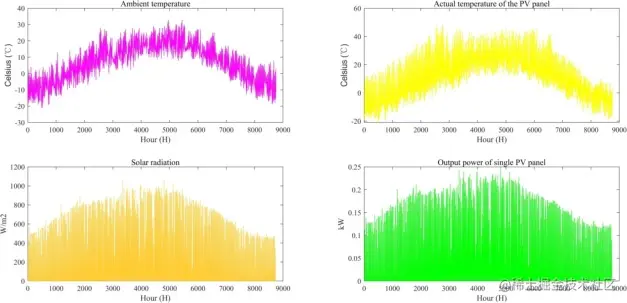 图6. 温度数据、太阳辐射强度和光伏板的每小时输出量。