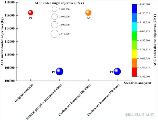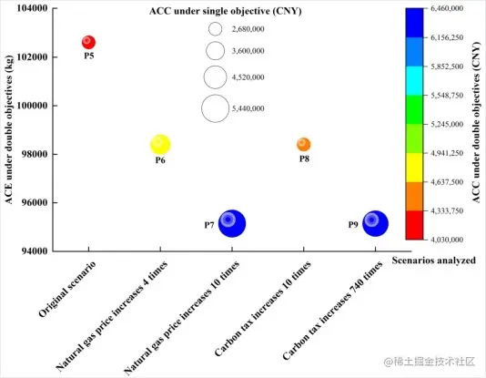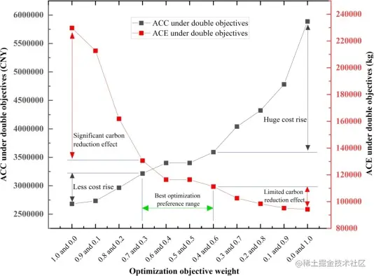 然而,在优化过程中,我们仍然需要关注优化性价比这个关键点。这是一个几乎没有现有研究讨论的细节。在本文构建的优化模型中,ACC和ACE是两个目标。如果我们付出的成本很高,但得到的碳减排却很少,那么这种优化在实际决策中就没有实际意义了。 图10生动地呈现了不同优化偏好下的ACC和ACE。
