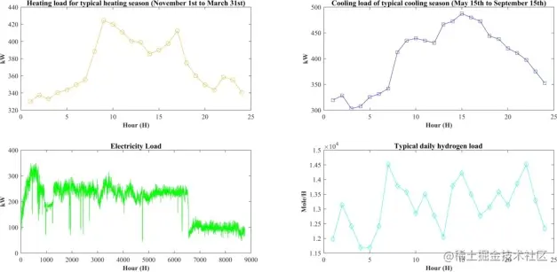 园区的供暖负荷和制冷负荷在供暖和制冷季节都高于电力负荷,所以冷热电三联供系统由燃气轮机驱动。一年中8760小时的电力负荷数据由中国国家电网公司的智能电表获得;园区提供了典型日子的冷、热负荷和氢气数据。 图4展示了四种类型的负荷数据随时间的分布。