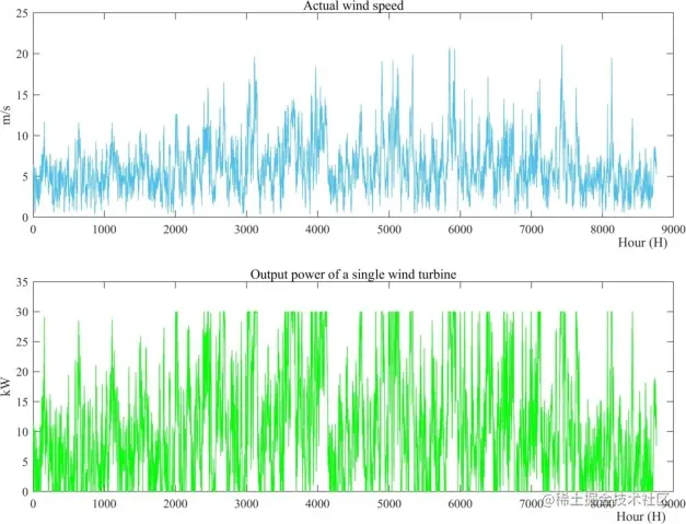 图7. 风速数据和风轮机每小时的输出。