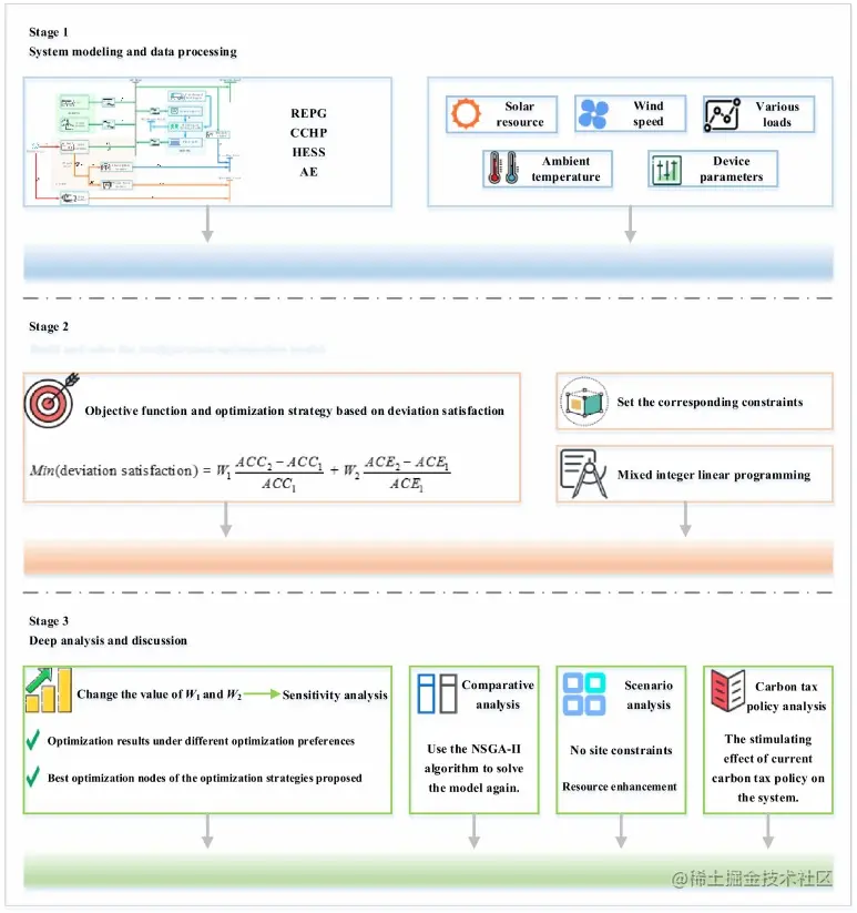- 第二阶段的主要工作是构建数学模型,并对国际能源署的数据进行处理。这一部分对应于3.1节,给出了REPG、CCHP、HESS子系统的数学模型。为了得到各设备的运行和输出,需要收集和处理太阳能资源、环境温度、风速、四种负荷以及各种设备参数数据。