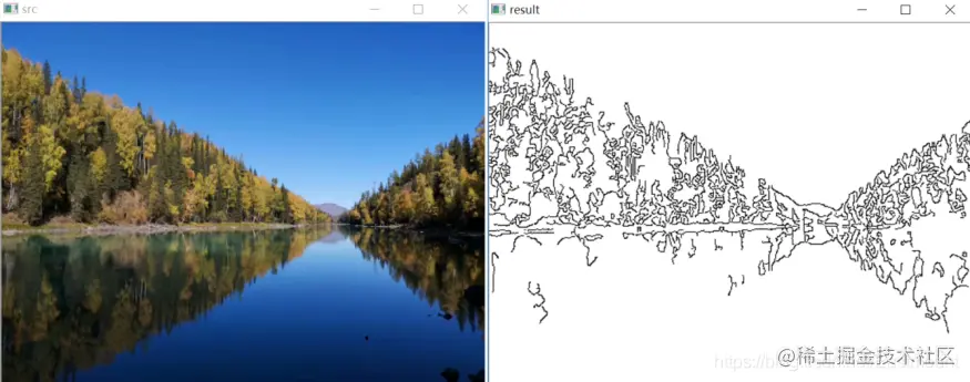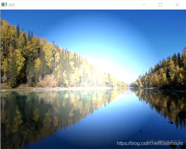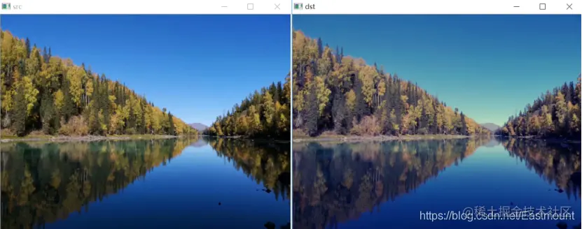 滤镜特效的运行结果如图所示,其中左边“src”为原始风景图像,右边“dst”为滤镜处理后的图像,其颜色变得更为鲜艳,对比度更强。