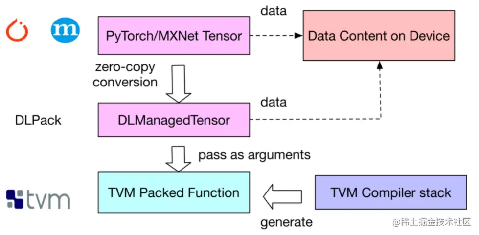 如果你想开发一款跨AI框架的深度学习编译器,DLPack就是一种可行的方案(TVM就是这条技术路线)。比如,我们在TVM中声明并编译一个矩阵乘法算子,然后基于DLPack表示构建一个包装器,该包装器能让此矩阵乘法算子支持PyTorch Tensor。对MxNet可以采用类似的操作。DLPack提供在AI框架和TVM之间共享的中间包装器的原理如下图所示: