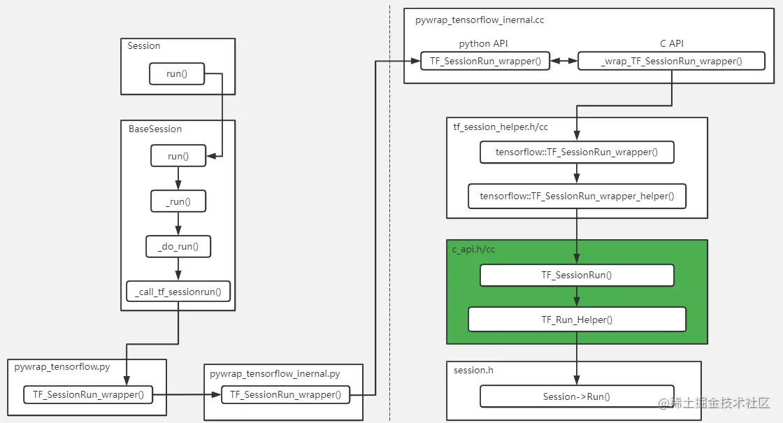 有些好奇宝宝可能会说:上面讲的太宏观,好像懂了,又好像没懂。没关系,接下来我们以静态图的运行接口session.run()为例,结合TensorFlow源码详细梳理一下前后端的映射过程,具体过程见下图: