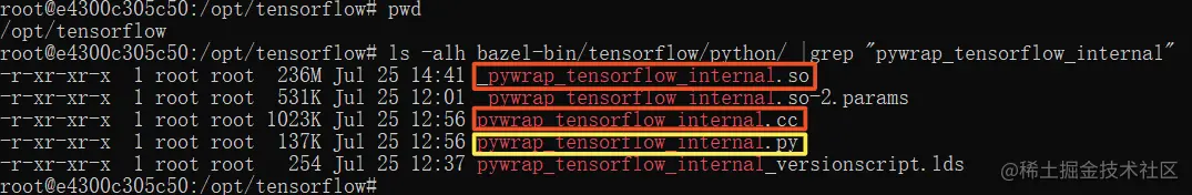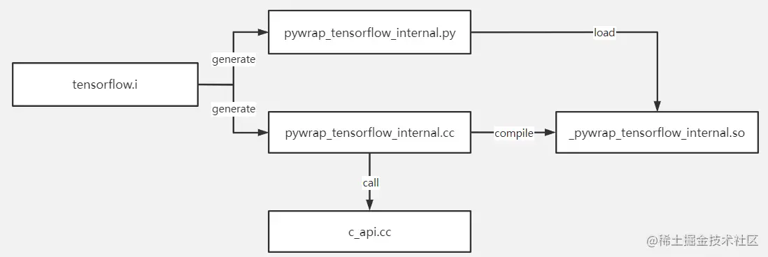 在TensorFlow的白皮书[7]中提到C API是连接前端用户代码和后端执行引擎的桥梁,为深入理解这个概念,建议读者参照TensorFlow官网从头编译源代码。TensorFlow v1.15.5基于Bazel进行编译,前端python与后端C++通过SWIG进行交互。实际上在系统编译之前会先启动SWIG代码生成过程,通过解析tensorflow.i自动生成两个wrapper文件:pywrap_tensorflow_internal.py和pywrap_tensorflow_internal.cc,前者对接前端python调用,后者对接后端C API调用。大家安装tensorflow官方二进制包后,只能看到py文件而没有cc文件。如果自己编译TensorFlow源码,可在项目根目录下的bazel-bin中找到相应的py和cc文件,如下图所示: