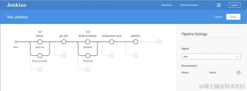 流水线编辑器:用于创建贯穿始终的持续交付流水线,是一种直观并可视化的流水线编辑器。