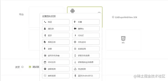 其中,其中部分隐私权限是敏感权限,如电话、位置、相机、麦克风、短信等,需要勾选,并在需要的时候,去申请,平台也提供了相应的接口,