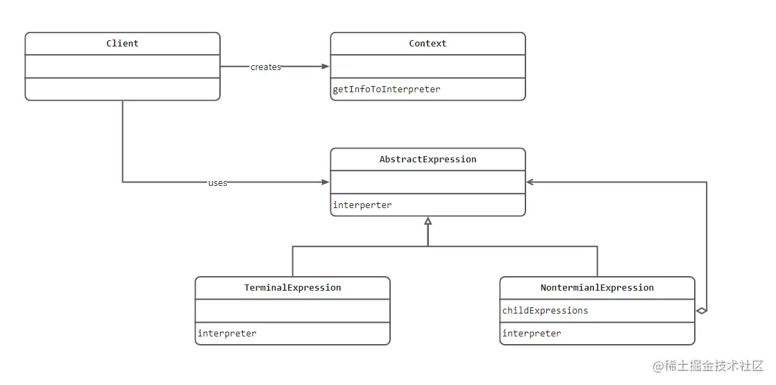 NonterminalExpression 对应于 BNF 的非终结符表达式,如示例程序的 CommandNode、RepeatCommand、CommandListNode 类