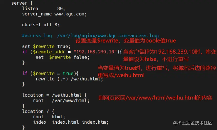 注: 如果rewrite (.+) /weihu.html; 改成rewrite (.+) /weihu.html permanent; 的话,如果是非 192.168.80.10 的主机访问会使浏览器修改请求访问的URL成 www.kgc.com/weihu.html 再请求访问,这样就会进入一直在 rewrite 的死循环,访问请求会一直被重写成 www.kgc.com/weihu.html 再请求访问