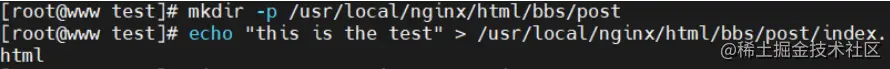 echo "this is test" >> /usr/local/nginx/html/bbs/post/index.html