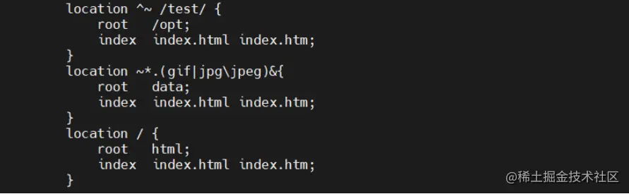 (location = 完整路径) > (location ^~ 路径) > (location ,* 正则顺序) > (location 部分起始路径) > (location /)
