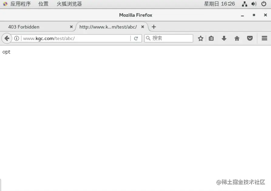 重启服务测试明显可以看出访问的是opt目录所以说正则匹配前缀的优先级要比后缀高。