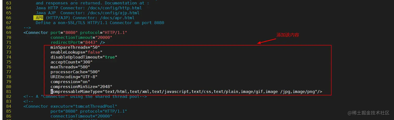 | 【compressionMinSize】 | 表示压缩响应的最小值,只有当响应报文大小大于这个值的时候才会对报文进行压缩,如果开启了压缩功能,默认值就是 2048。 |