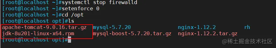 2.1、关闭防火墙,将安装 Tomcat 所需软件包传到/opt目录下