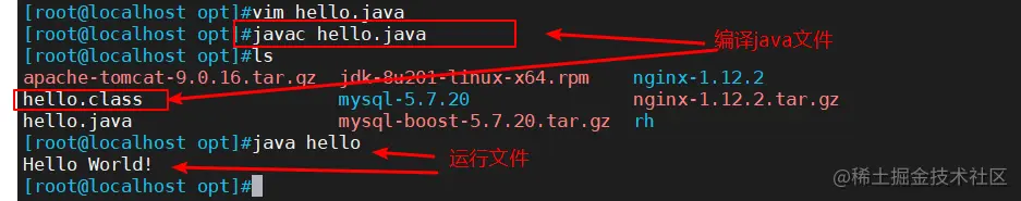 编译完成后,如果没有报错信息,输入命令: java Hello,运行class字节码文件,由JVM 对字节码进行解释和运行,打印"Hello World"