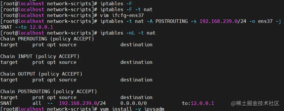 iptables -t nat -A POSTROUTING -s 192.168.239.0/24 -o ens37 -j SNAT --to 12.0.0.1