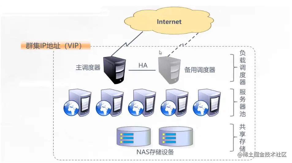 访问整个集群系统的唯一入口,对外使用所有服务器共有的VIP地址,也成为群集IP地址。通常会配置主,备两台调度器实现热备份,当主调度器失效以后能够平滑替换至备用调度器,确保高可用。