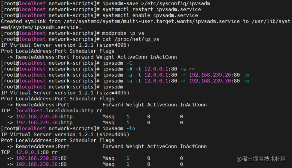 ipvsadm -a -t 12.0.0.1:80 -r 192.168.239.20:80 -m #添加节点服务器及IP地址指定模式lvs