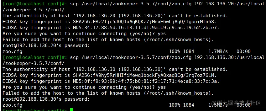 scp /usr/local/zookeeper-3.5.7/conf/zoo.cfg 192.168.136.20:/usr/local/zookeeper-3.5.7/conf/