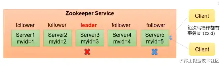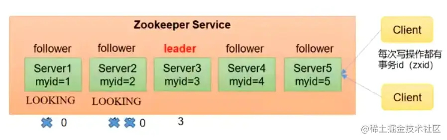 假设ZooKeeper由5台服务器组成,SID分别为1、2、3、4、5,ZXID分别为8、8、8、7、7,并且此时SID为3的服务器是Leader。某一时刻,3和5服务器出现故障,因此开始进行Leader选举。
