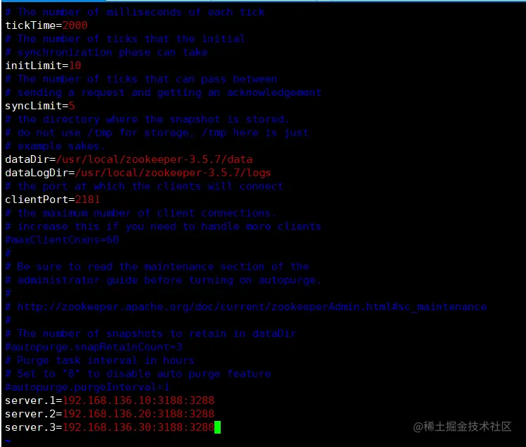 dataLogDir=/usr/local/zookeeper-3.5.7/logs ●添加, 指定存放日志的目录,目录需要单独创建