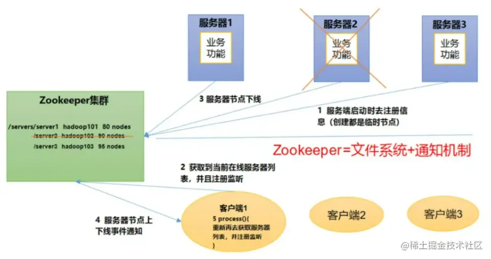 (1)分布式环境中,实时掌握每个节点的状态是必要的。可根据节点实时状态做出一些调整。 (2)ZooKeeper可以实现实时监控节点状态变化。可将节点信息写入ZooKeeper上的一个ZNode。监听这个ZNode可获取它的实时状态变化。