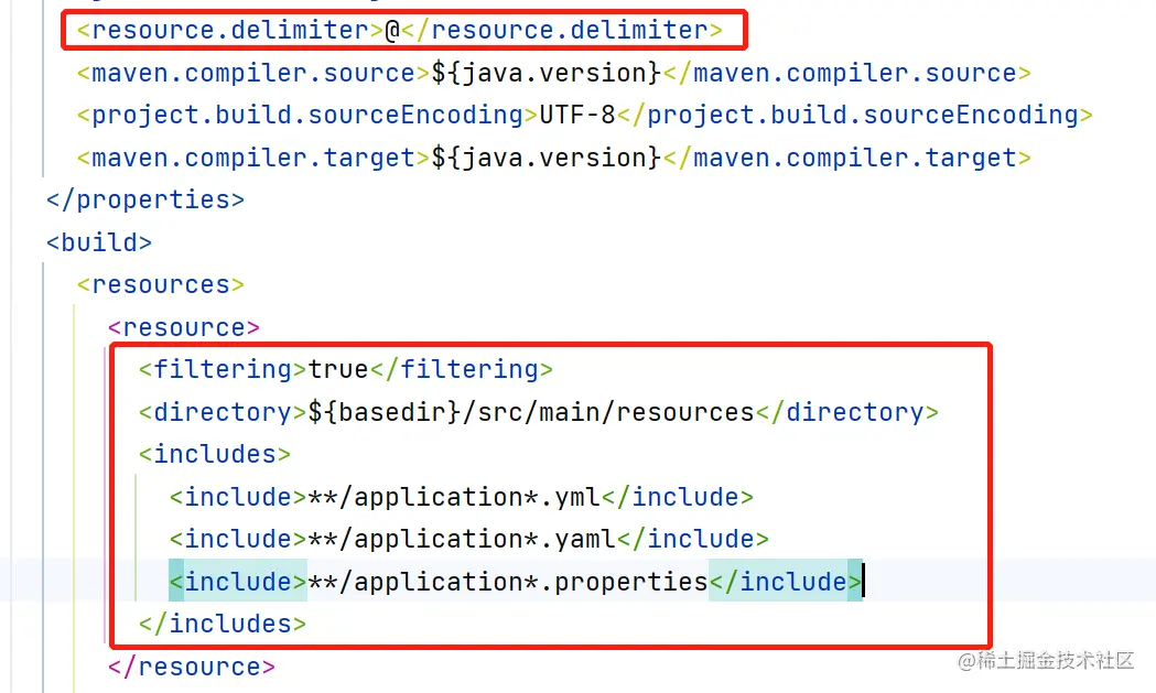 Tips: 注意,由于 application.properties 和 application.yml 文件接受 spring 样式的占位符(${…}),所以 maven filter 将更改为使用@…@占位符。(可以通过设置名为 resource.delimiter 的 maven 属性来覆盖该属性。)