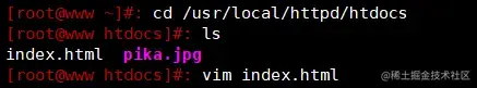 cd /usr/local/httpd/htdocs #yum安装的httpd服务的默认路径为/var/www/html/