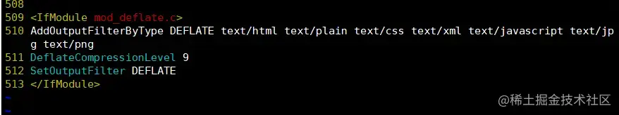 SetOutputFilter DEFLATE #代表启用deflate 模块对本站点的输出进行gzip压缩