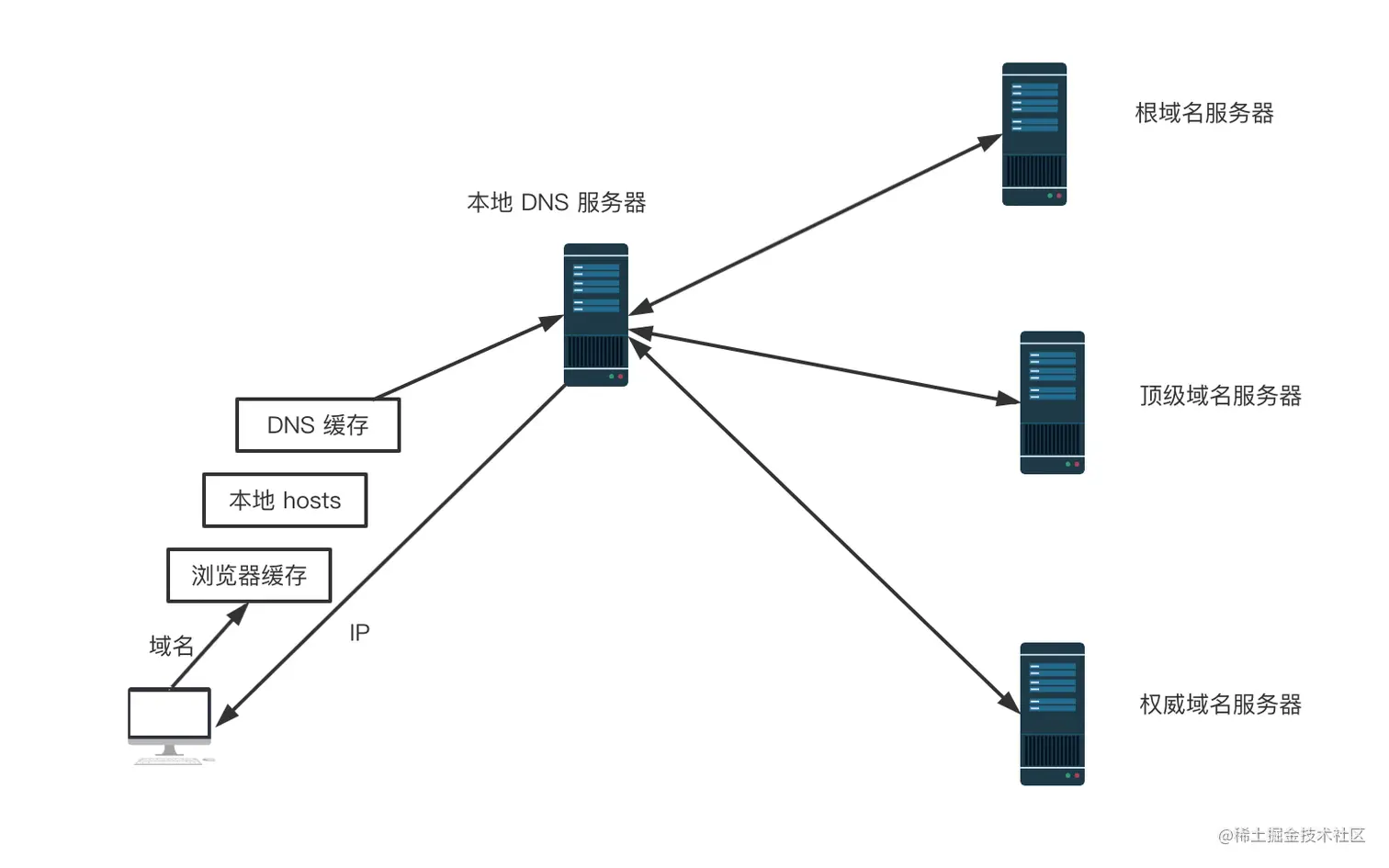 本地 DNS 会依次请求根域名服务器拿到对应的顶级域名服务器的地址,然后请求顶级域名服务器,拿到权威域名服务器的地址,之后权威域名服务器会返回最终的 IP 给本地 DNS 服务器,由它再返给浏览器。