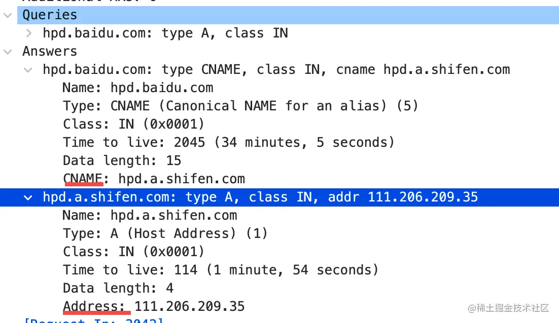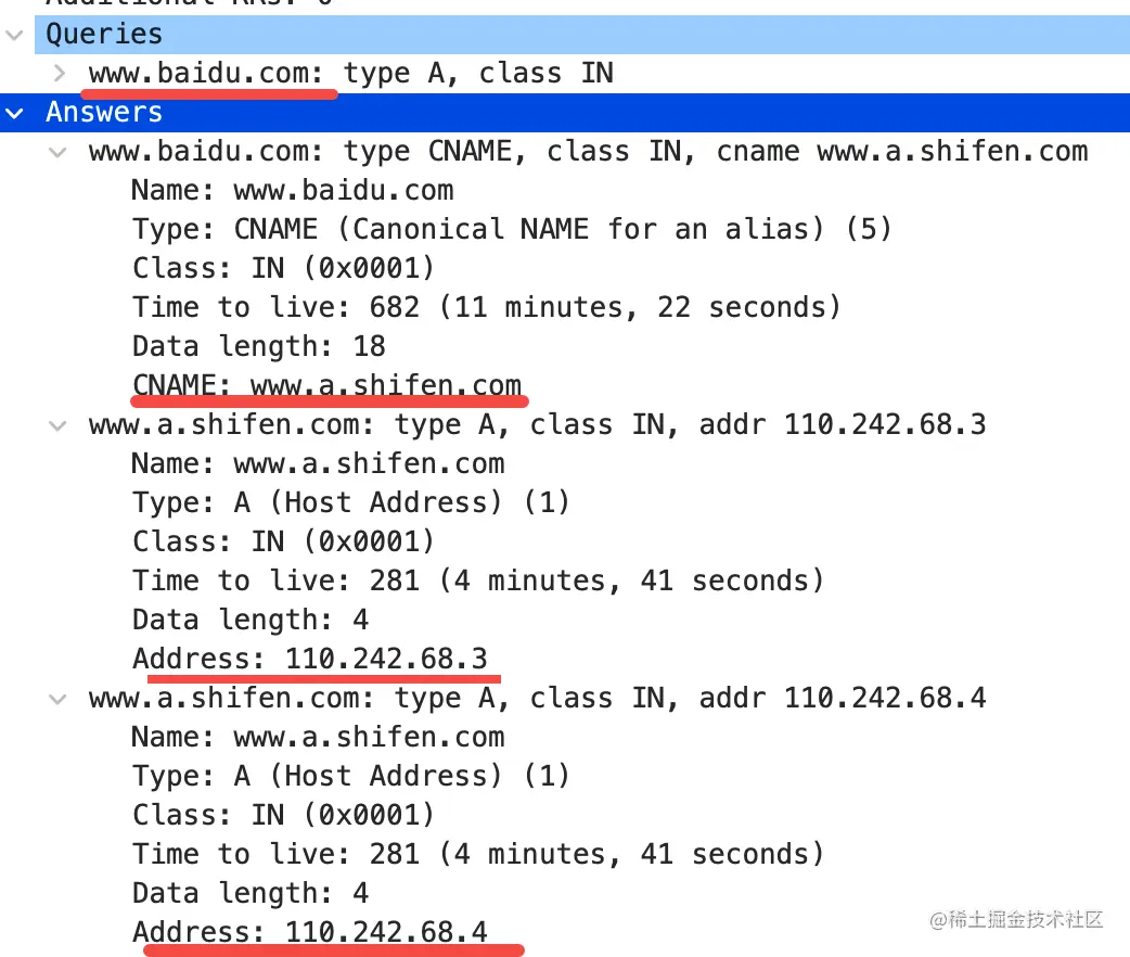 你会发现有的返回结果是 CNAME,值为一个域名,这个 CNAME 是一种记录类型,别名的意思。之后会再去这里查,最后查到 A 的记录类型,值就是 IP 了。