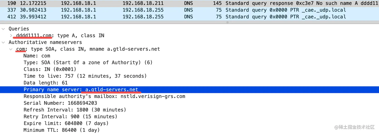 这时候可以看到请求了 com 的域名服务器,地址是 a.gtld-server.net,没错,这个就是一个顶级域名服务器的域名。