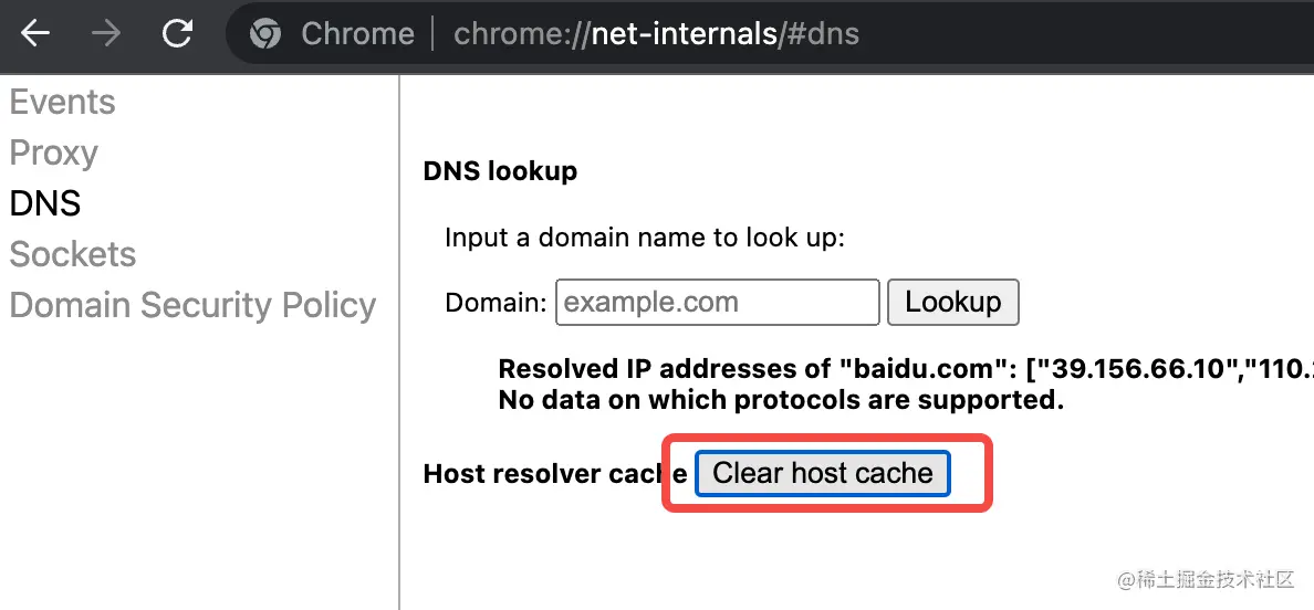 然后你可以打开 chrome://net-internals/#dns ,查询某个域名的浏览器 DNS 缓存: