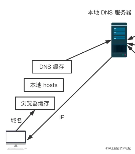 DNS 的流程是会先查找浏览器 DNS 缓存、hosts 文件、系统 DNS 缓存,然后请求本地 DNS 服务器,由它去一级级查询最终的 IP: