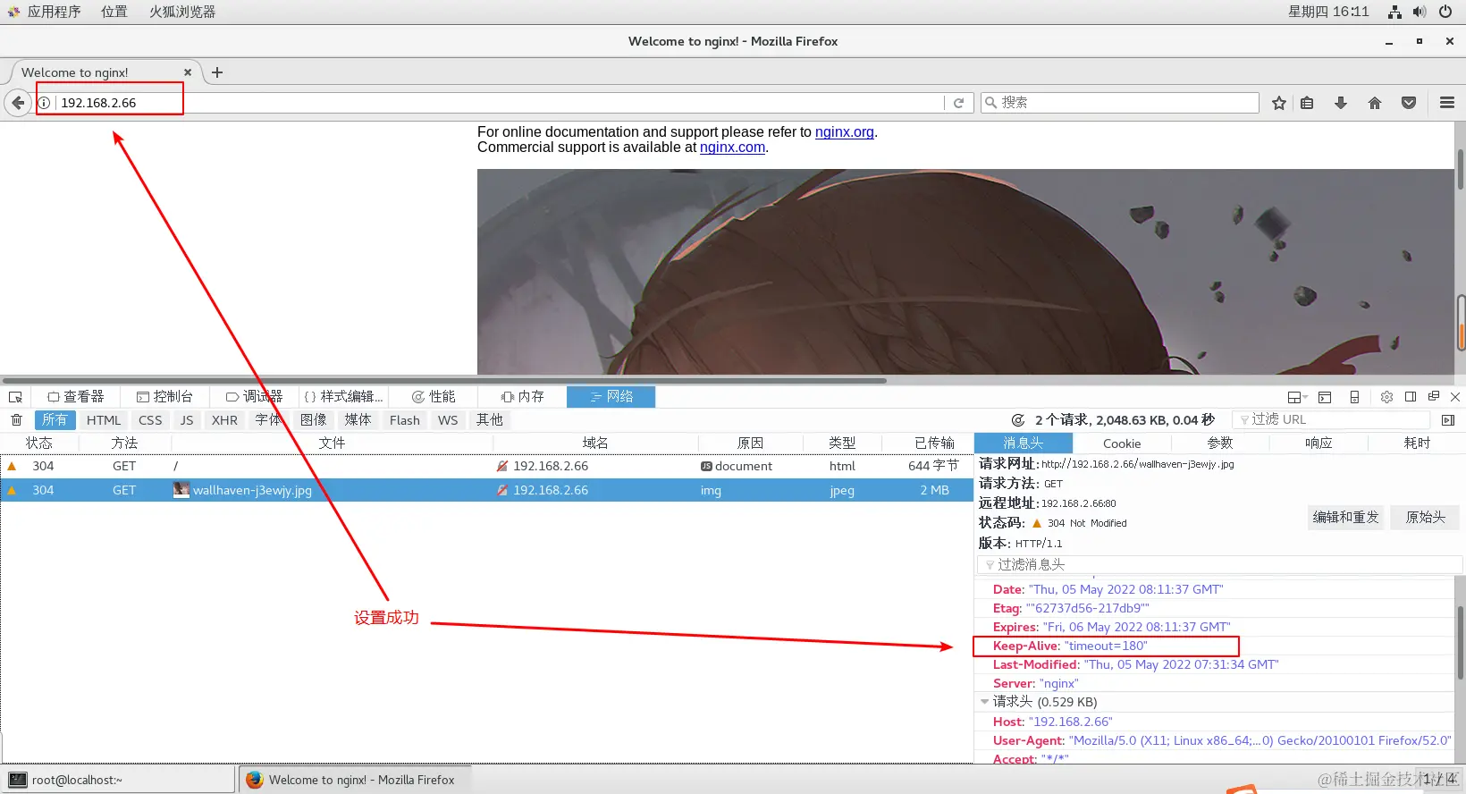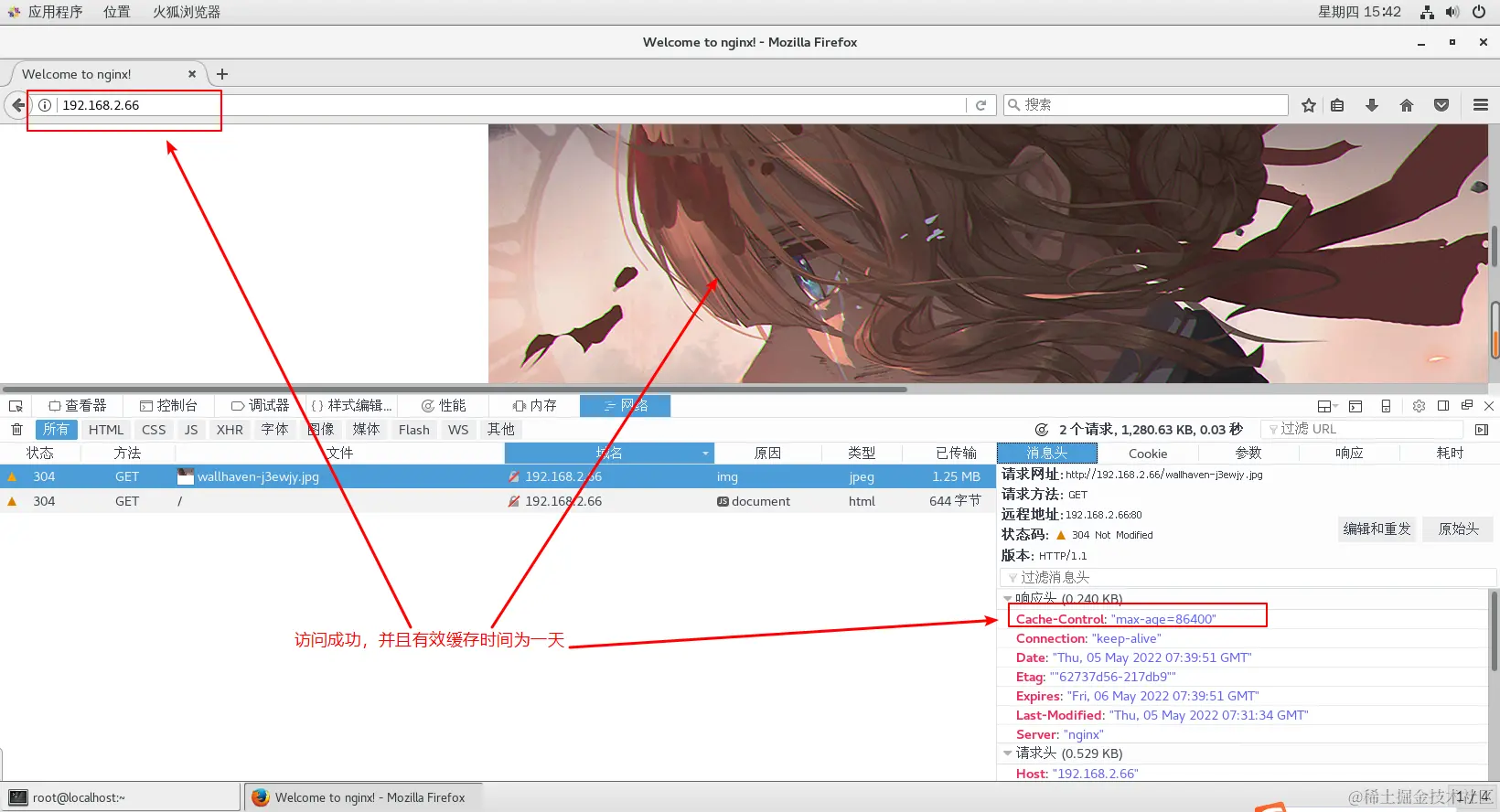 访问 http://192.168.2.66,双击200响应消息查看响应头中包含 Cahce-Control:max-age=86400 表示缓存时间是 86400 秒。也就是缓存一天的时间,一天之内浏览器访问这个页面,都是用缓存中的数据,而不需要向 Nginx 服务器重新发出请求,减少了服务器的使用带宽。