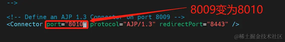 <Connector port="8010" protocol="AJP/1.3" redirectPort="8443" />