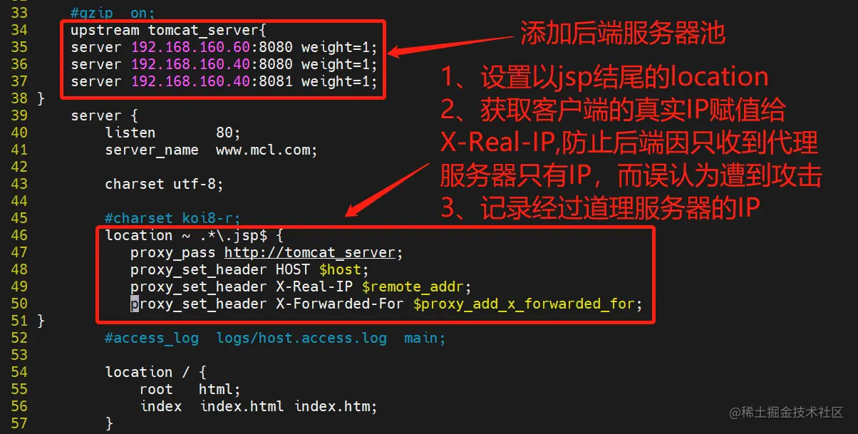 session共享问题可用后端服务的session共享代替nginx的ip_hash。ip_hash无法作用于四层反向代理,配置需要将其他模式删除例如weight删掉然后直接在加上