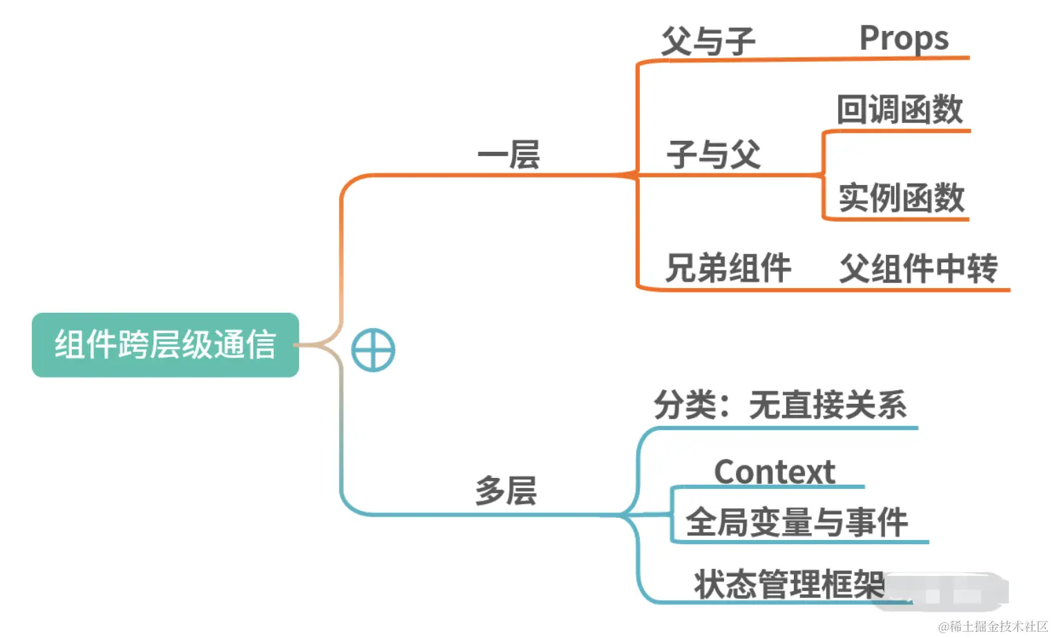 通过 React 的 ref API 获取子组件的实例,然后是通过实例调用子组件的实例函数。这种方式在过去常见于 Modal 框的显示与隐藏 - 多层级间的数据通信,有两种情况 。第一种是一个容器中包含了多层子组件,需要最底部的子组件与顶部组件进行通信。在这种情况下,如果不断透传 Props 或回调函数,不仅代码层级太深,后续也很不好维护。第二种是两个组件不相关,在整个 React 的组件树的两侧,完全不相交。那么基于多层级间的通信一般有三个方案。