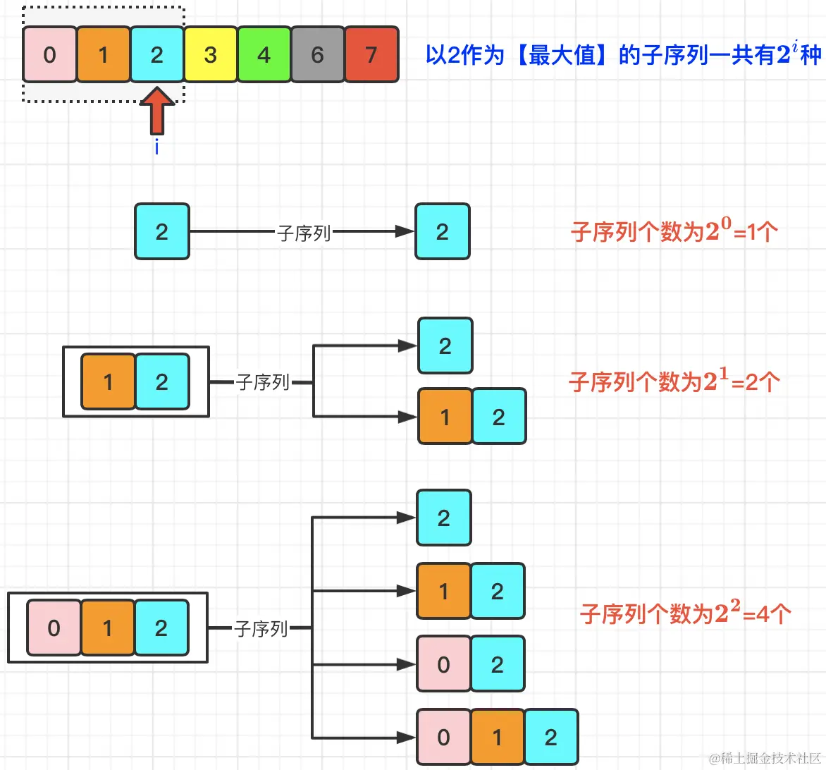 下面是以nums[i]和其左侧所有元素拼装组合成的子序列示例: