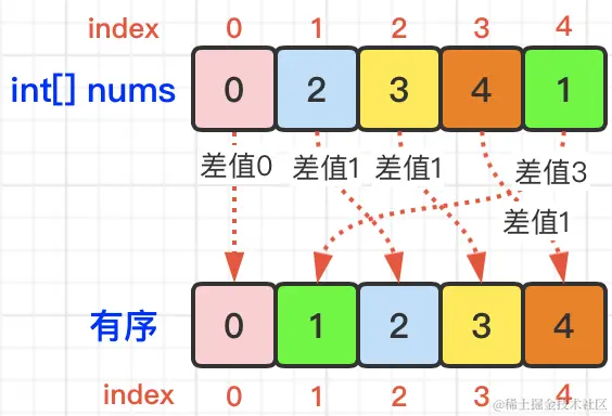 所以,就可以通过nums[i]-i计算出i位置的元素与有序后的位置之间的差值: